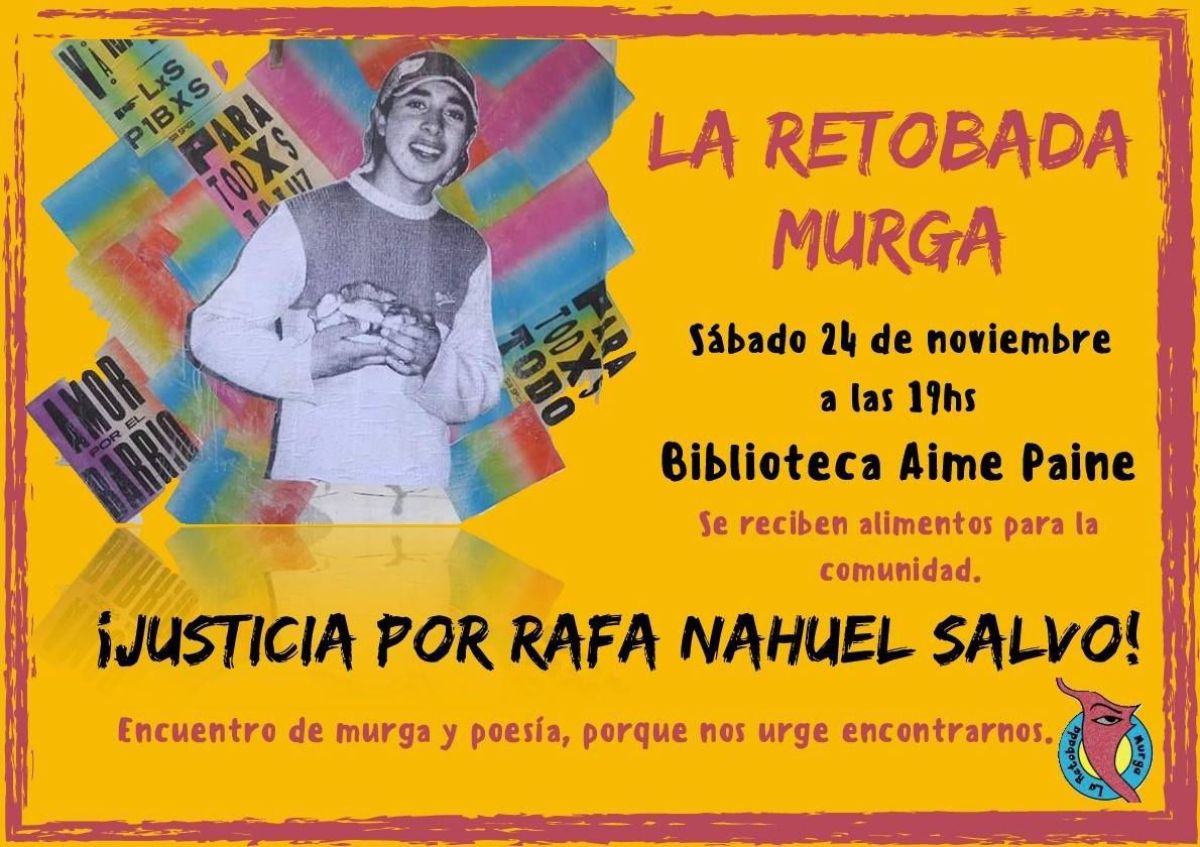 Este sábado 24 de noviembre, desde las 19 horas, se realizará un encuentro cultural organizado por la murga La Retobada reclamando justicia por Rafael Nahuel.
