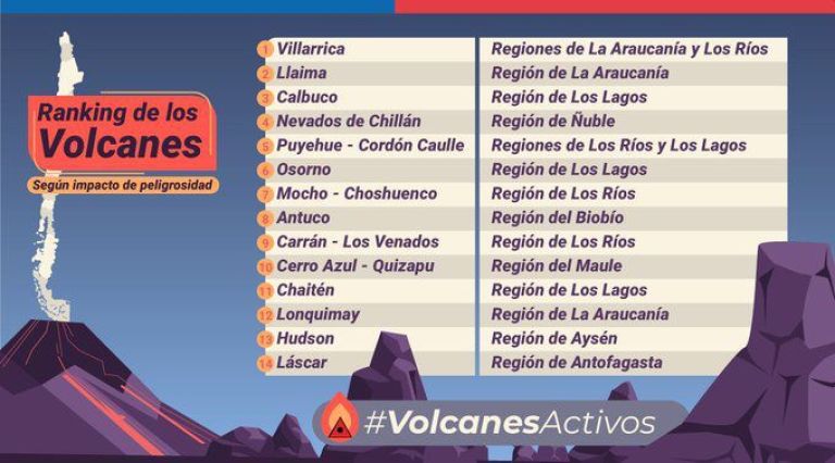 Los 14 volcanes más peligroso de Chile - ordenados de mayor a menor riesgo - son Villarrica, Llaima, Calbuco, Nevados de Chillán, Puyehue-Cordón Caulle, Osorno, Mocho-Choshuenco, Antuco, Carrán-Los Venados, Cerro Azul-Quizapu, Chaitén, Lonquimay, Hudson y Láscar, la mayoría correspondientes a las regiones de Bío Bío, Araucanía, Ríos, Lagos y Aysen, sectores lindantes a la Patagonia argentina.
