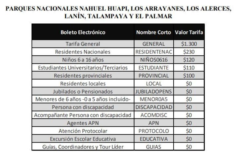 Estas mismas tarifas tendrán vigencia para los Parques Nacionales Nahuel Huapi, Los Arrayanes, Los Alerces, Lanin, Talampaya y El Palmar.