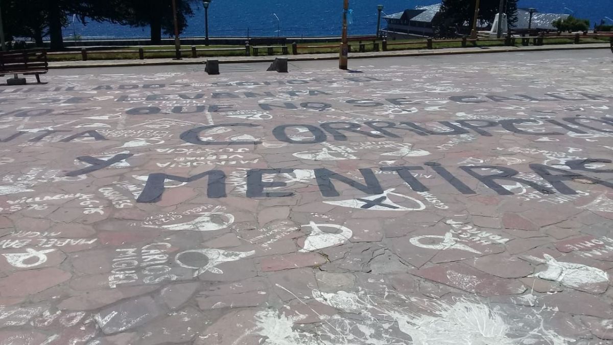 Conocida también como “La plaza de los Pañuelos”,  el monumento central de Bariloche se convitió em un símbolo de resistencia y lucha contra la dictadura militar y la impunidad, haciendo vigente la consigna de Memoria, Verdad y Justicia. Este domingo, expresiones de odio y contra el movimiento de Derechos Humanos, aparecieron pintadas con negro sobre el mismo suelo.