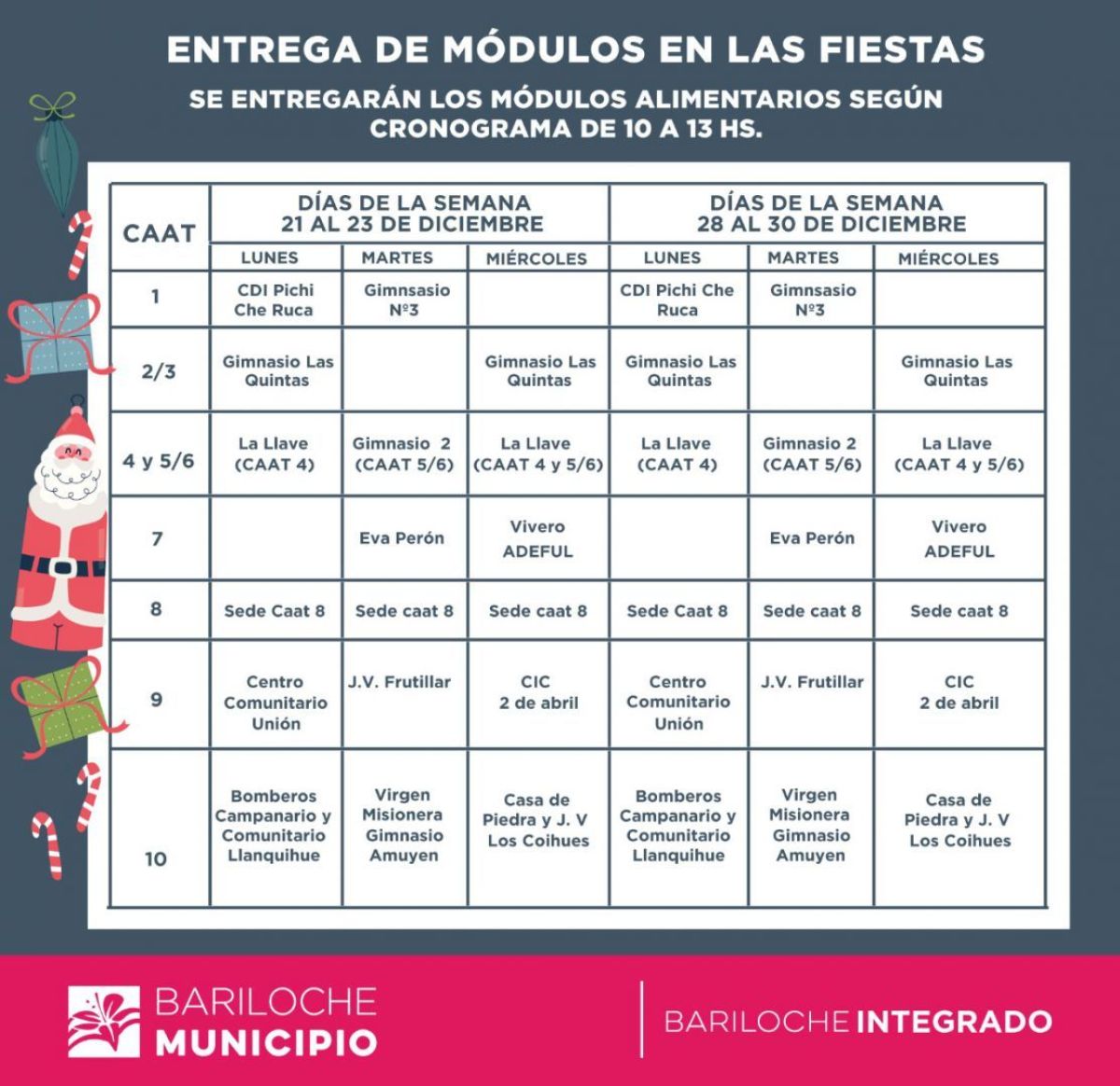 La Secretaría de Desarrollo Humano Integral comunica a los vecinos y vecinas de Bariloche que con motivo de las Fiestas de Navidad y Año Nuevo, que caen jueves y viernes 24, 25 y 30, 1°, se modifican los días de entrega de módulos.