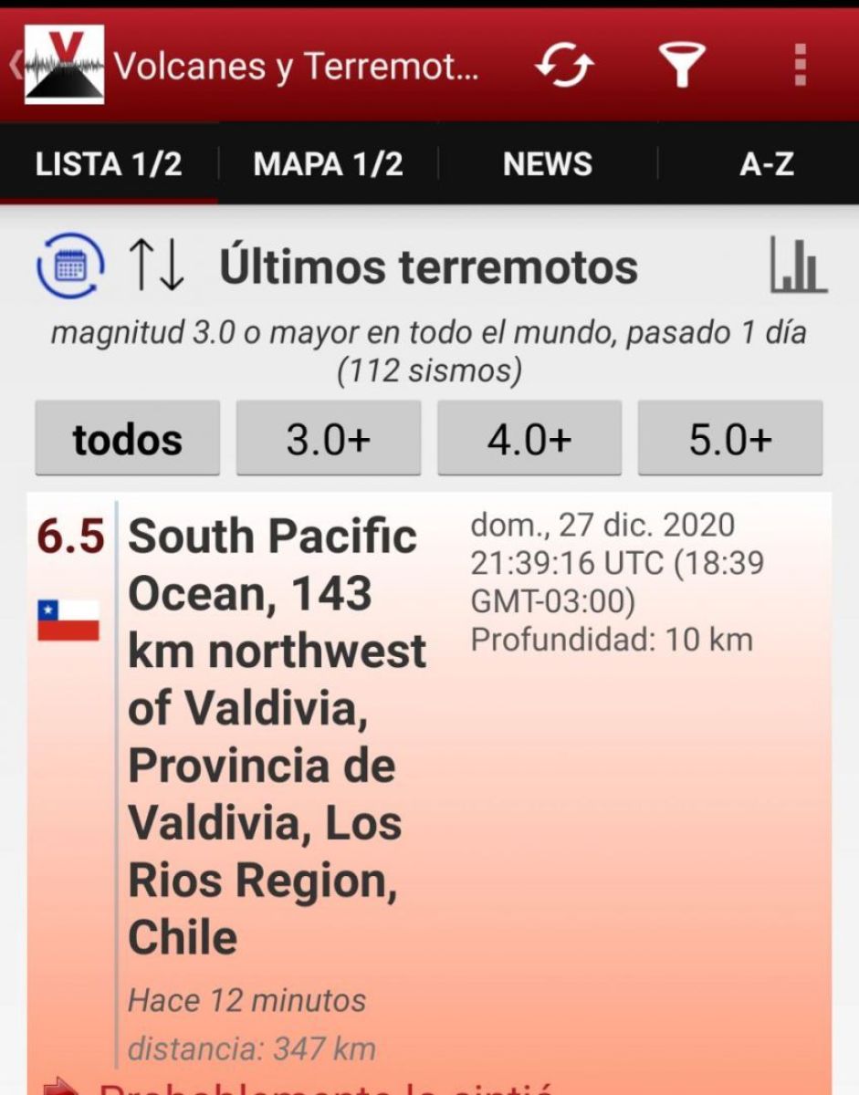 El reporte del Centro Sismológico Nacional de Chile cifró en 6,7 la magnitud del temblor, con epicentro 144 kilómetros al oeste de Toltén, en la costa de La Araucanía, y una profundidad de 26,5 kilómetros.