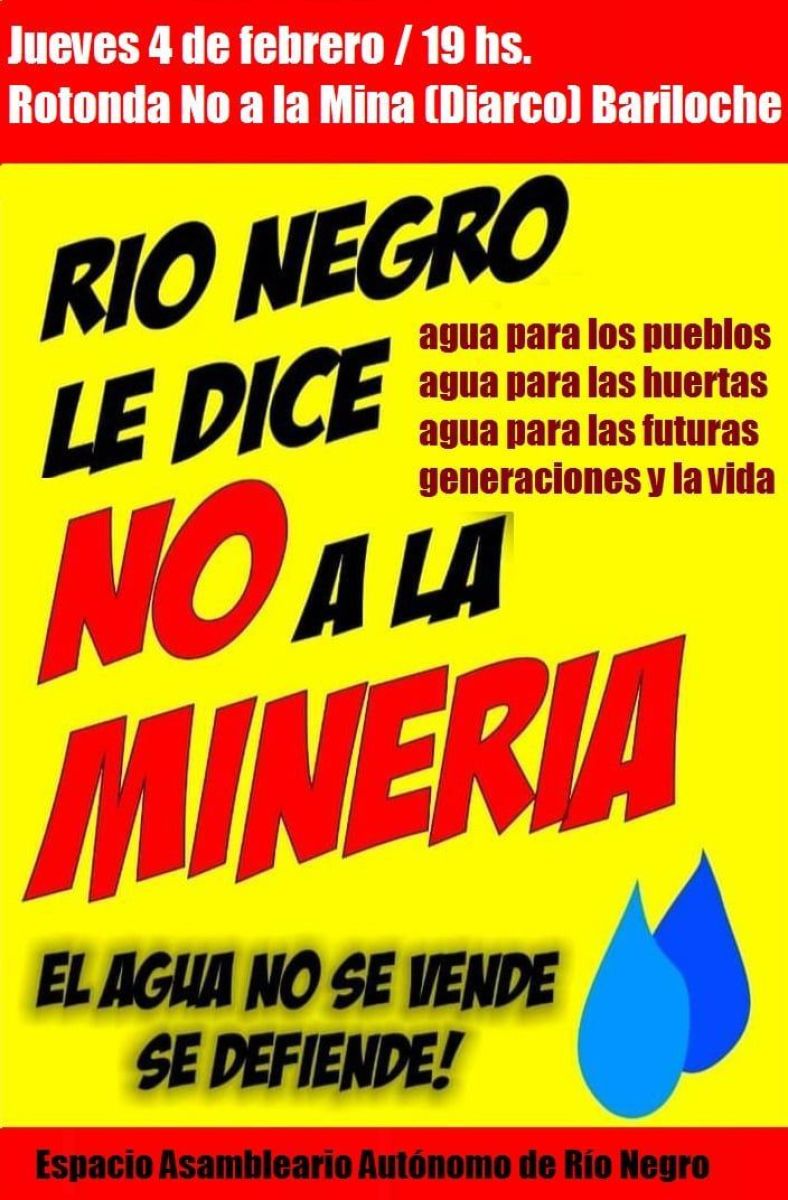 Desde el Espacio Asambleario Autónomo de Río Negro convocaron este jueves 4 de febrero a las 19 horas a manifestarse contra la megaminería en la entrada sur de Bariloche, en la rotonda de Diarco.