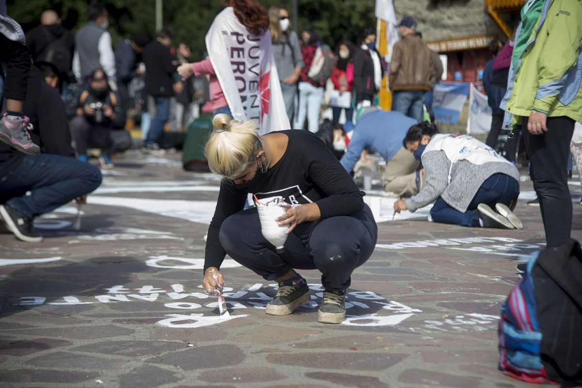 Luego de un año de no poder conmemorar el 24 de marzo por la pandemia del coronavirus, durante esta mañana se repasaron con pintura blanca los pañuelos que simbolizan la lucha de las Abuelas de Plaza de Mayo y el nombre y fecha de desaparición de cada una de las víctimas de terrorismo de Estado. Este año, además se agregó el nombre de Andrés Quinteros, el joven kayakista que desapareció en el lago Moreno en diciembre pasado.