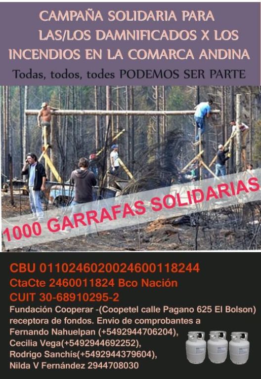 Así, en conjunto con la Fundación Cooperar, que dispone la parte administrativa y  logística, Nahuelpan y vecinos de la zona buscan recaudar fondos para conseguir cerca de mil garrafas y ayudar a los pobladores de El Hoyo, Las Golondrinas, Cholila, El Maitén, Lago Puelo y Epuyén. “Queremos hacer un aporte más a todo lo que se está haciendo. Ayudar con lo que la gente necesita para poder reconstruir sus viviendas, su vida”, expresó.