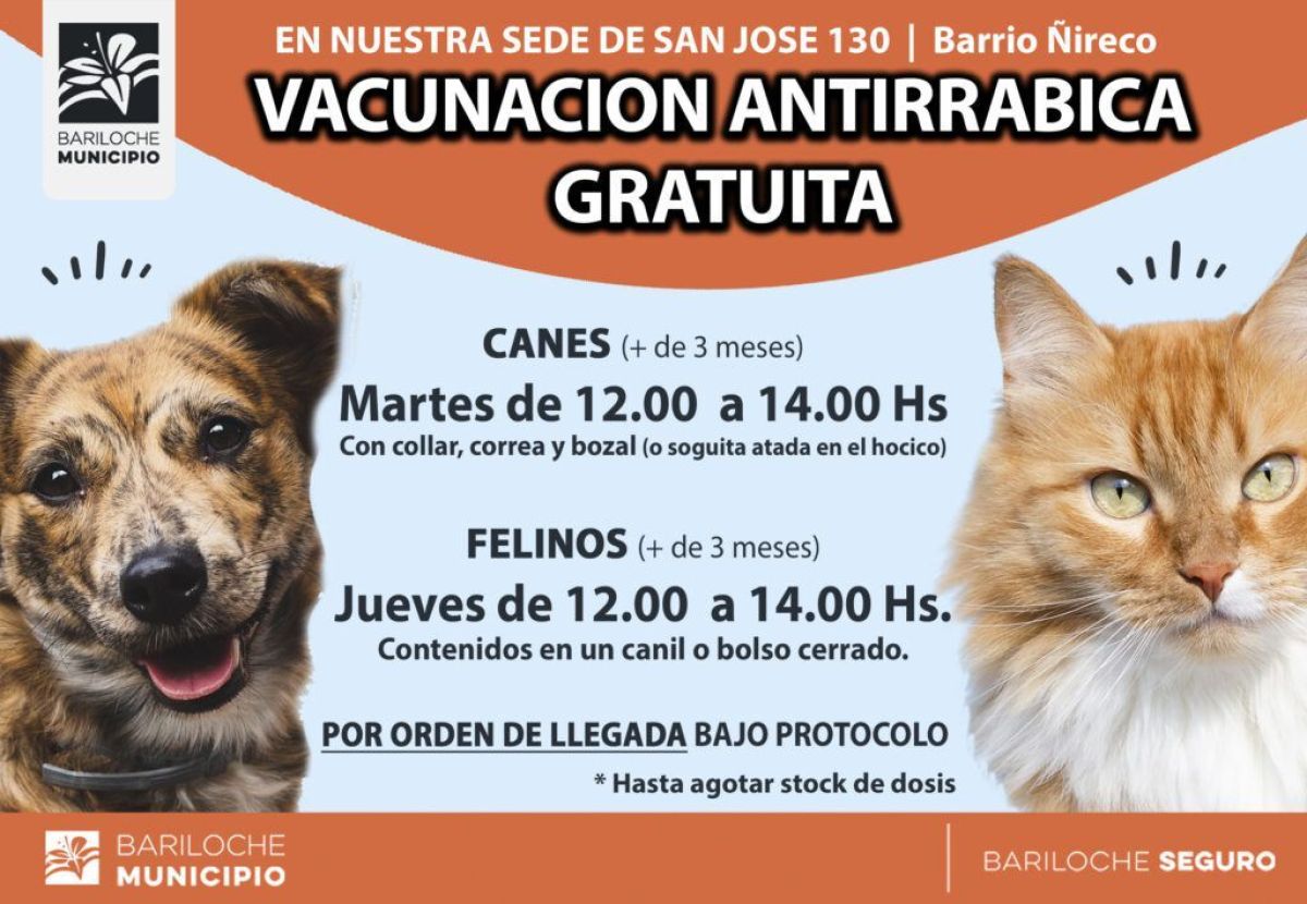 Continúa implementándose la Campaña de Vacunación Antirrábica Gratuita, a cargo de la Dirección General de Seguridad Animal de la Municipalidad de Bariloche. La campaña es tanto para gatos como para perros, que sean mayores de 3 meses de edad. La misma se realiza en la sede de calle San José Nº 130 (Barrio Ñireco, frente a la Subsecretaría de Tránsito y Transporte) y la atención es sin turno, por orden de llegada y con protocolos de distanciamiento.