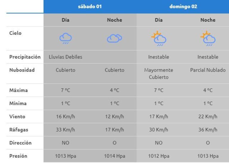 Estas condiciones se mantendrán durante el sábado 1 y domingo 2, con  lluvias y nevadas en la Zona andina de Río Negro, lagos, Norte del Neuquén, y Alta cuenca del Río Colorado.