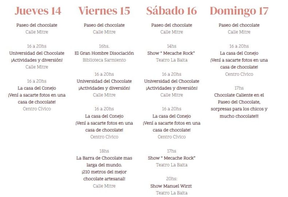 La fiesta se desarrollará entre el jueves 14 y el domingo 17 de abril y el principal atractivo será la fabricación de la "barra de chocolate más grande del mundo", que se realizara el viernes 15 por la tarde.