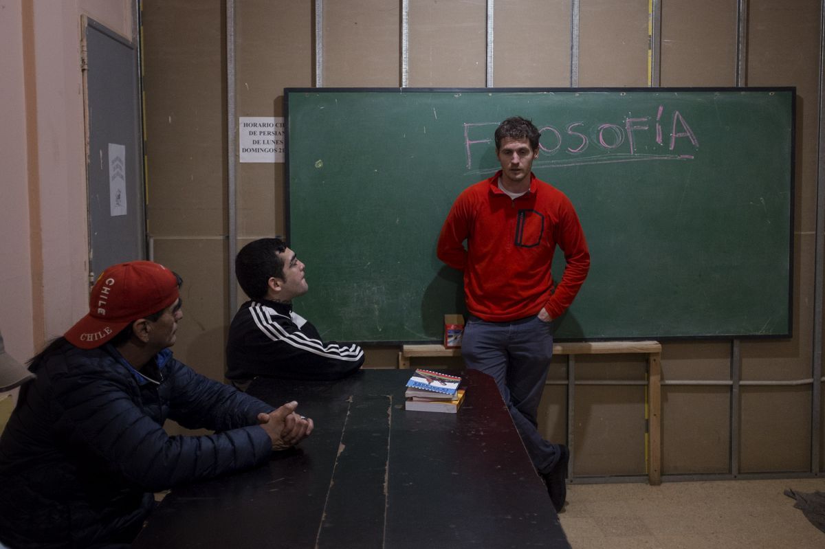 La religión, la política, la justicia. Algunos de los temas que son eje de debates en la calle, en cualquier cena o reunión de las personas que viven en libertad, pero ahora también en el salón que oficia de aula, donde cada viernes, Nahuel se reúne con un grupo de hombres que están próximos a volver a la calle.