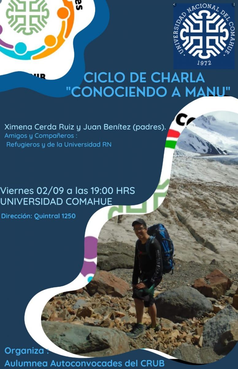 Este viernes 2 de septiembre se llevará a cabo la charla Conociendo a Manu. El encuentro que será a las 19 en la sede de la Universidad Nacional del Comahue, contará con la presencia de Juan Benítez y Ximena Cerda Ruiz, padres del joven.
