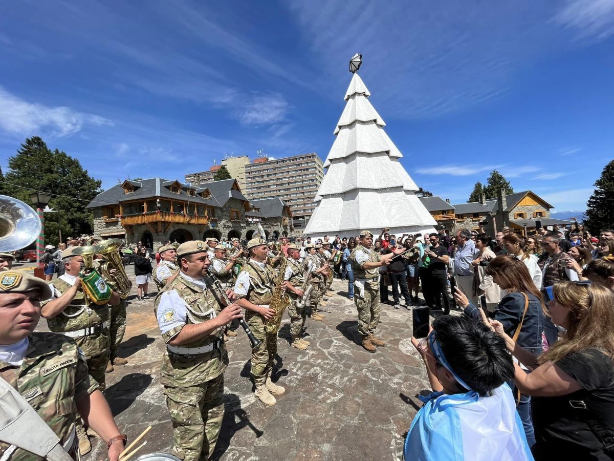 Durante la presentación espontánea, gran cantidad de residentes de Bariloche y de turistas acompañaron a la Banda Militar en los cantos y en la caravana al Centro Cívico.