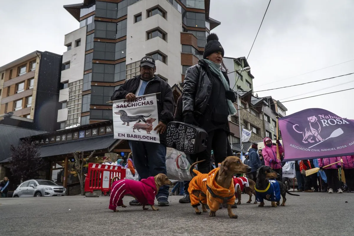 Los perros también participaron del desfile y lo hicieron abrigados para sobrellevar el frío. Foto: Marcelo Martínez.