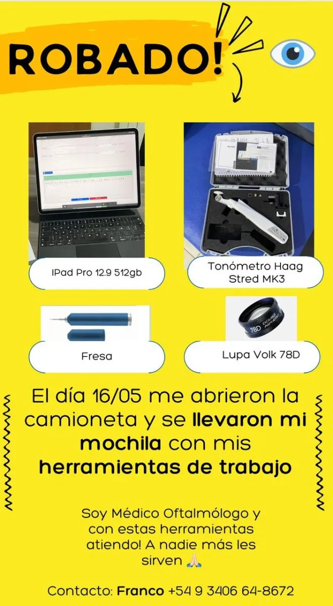 Le robaron materiales de trabajo a un oftalmólogo y pide recuperarlos
