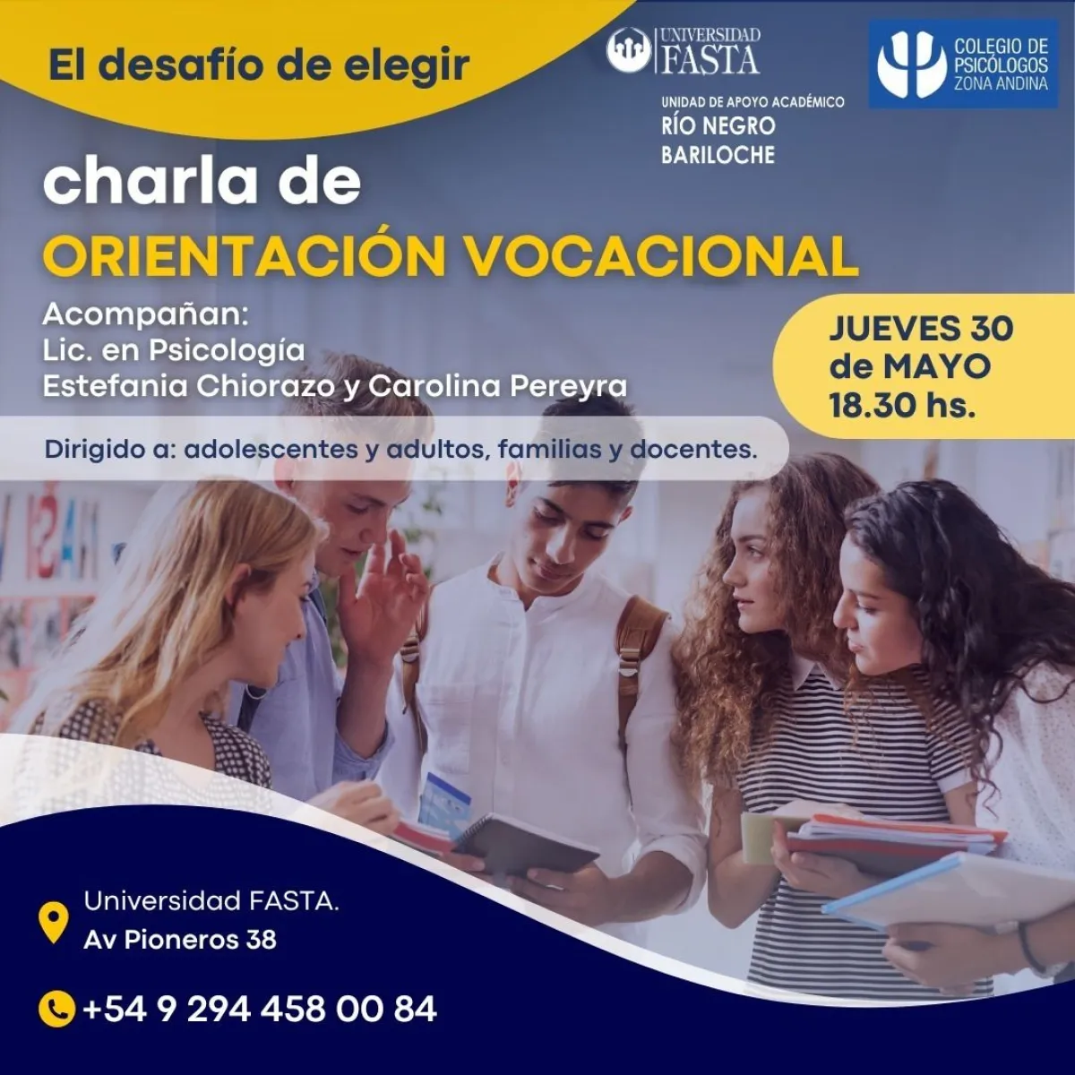 La Universidad FASTA Bariloche y el Colegio de Psicólogos zona Andina invitan a la comunidad a participar de una charla de orientación vocacional: “El desafío de elegir”.