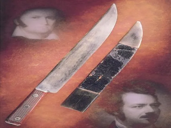 Imagen del cuchillo carnicero que, según se cree, llevo James Bowie al duelo en Sandbar Fight, lugar donde se batió a duelo.