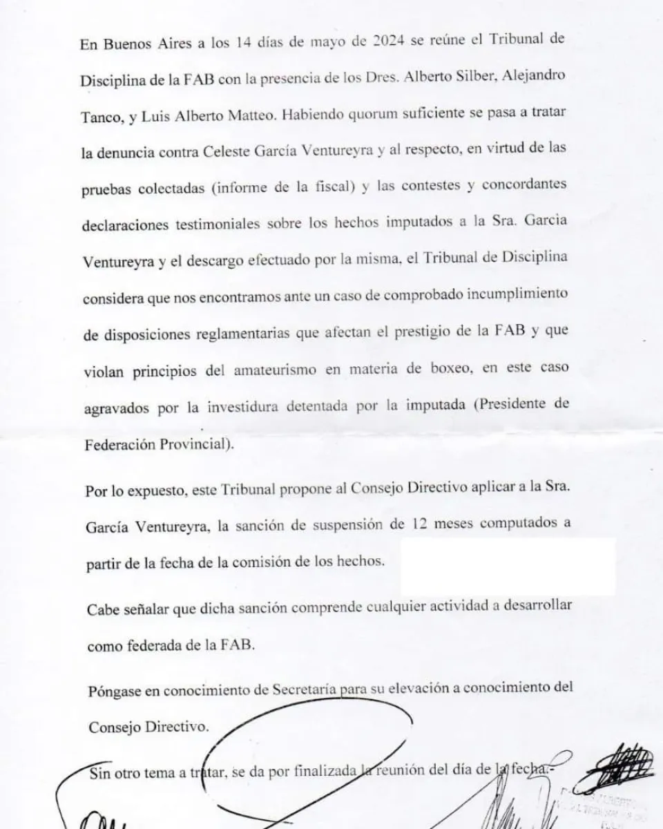 En virtud de las pruebas colectadas y las constestes y concordantes declaraciones testimoniales sobre los hechos imputados a la Sra. García Ventureyra y el descargo efectuado por la misma, el Tribunal de Disciplina considera que nos encontramos ante un caso de comprobado incumplimiento de disposiciones reglamentarias que afectan el prestigio de la FAB y que violan principios del amateurismo en materia de boxeo, en este caso agravados por la investidura detentada por la imputada (Presidente de la Federación Provincial)” dice el texto.