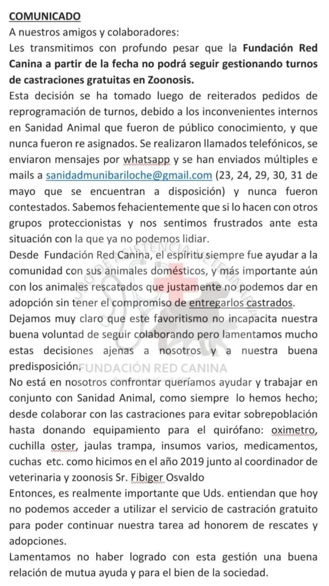 La Fundación Red Canina emitió un comunicado en el que expone la falta de respuestas por parte de Sanidad Animal, en cuanto a reprogramación de turnos y atención sanitaria. Afirman que es la primera vez que se presenta este inconveniente y que por este motivo dejarán de gestionar el servicio de castración gratuita en Zoonosis.