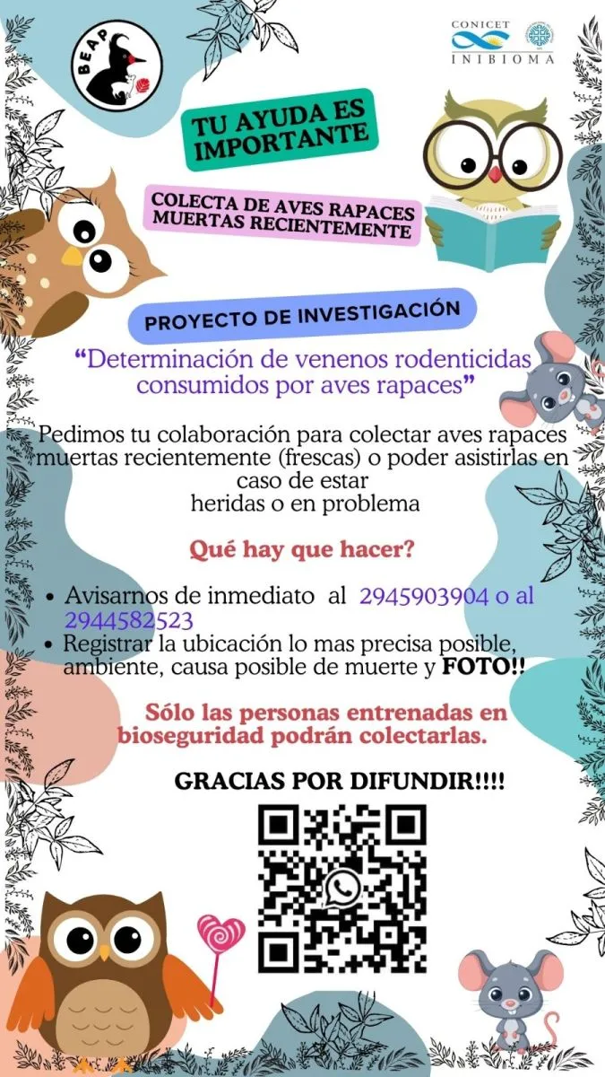 Para comunicarse con el equipo de investigación “Determinación de proyectos rodenticidas consumidos por aves rapaces” enviar un mensaje de Whatsapp al: 2945903904 o al 2944582523.