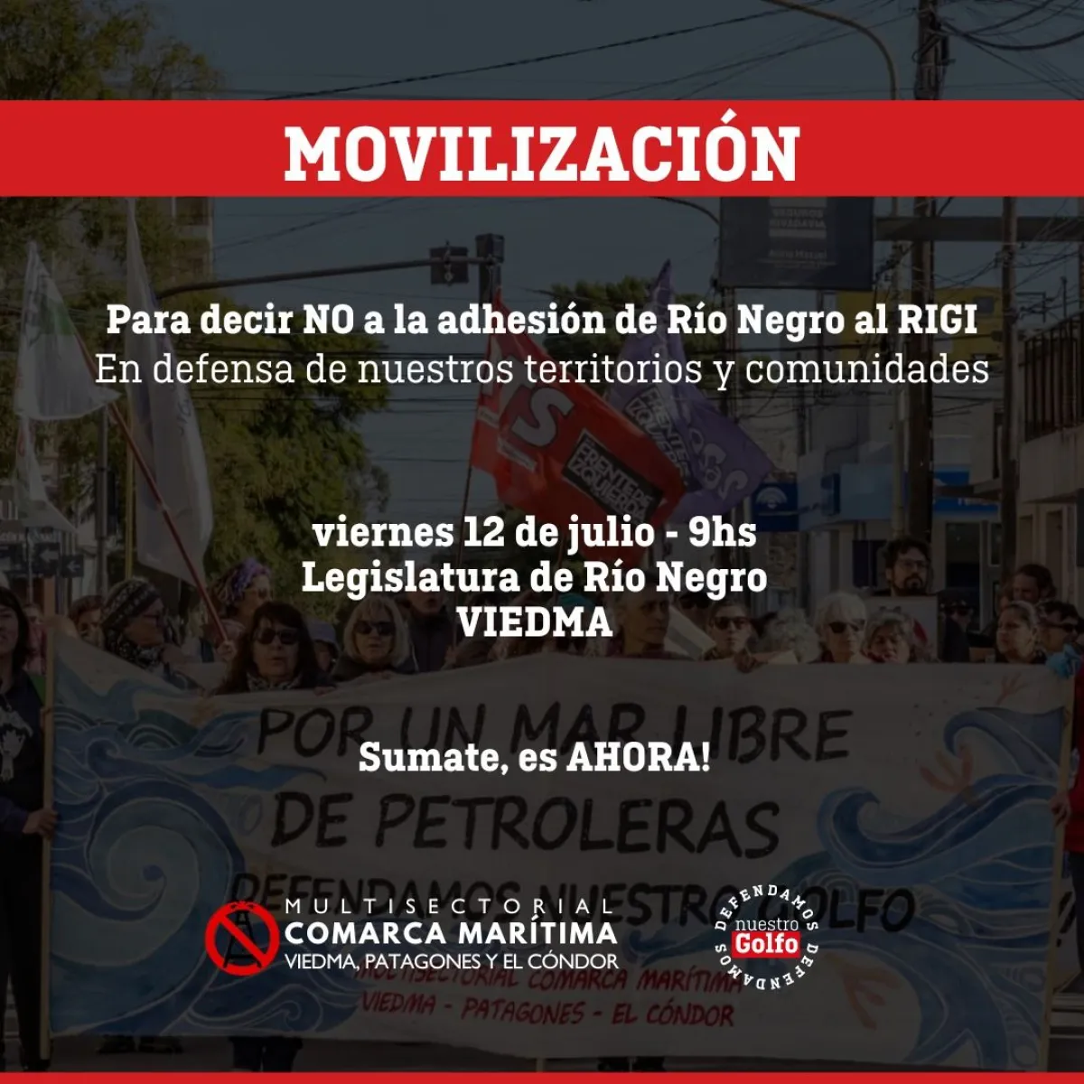 Mientras se discute el proyecto, en la puerta de la Legislatura se manifestará la Multisectorial Comarca Marítima de Viedma, Patagones y El Cóndor. En el comunicado que se difundió por redes sociales expresan: “En Río Negro el gobernador Weretilneck convocó a la Legislatura de Río Negro para ser nuevamente cómplice de sus planes entreguistas. “Esta vez para que la provincia adhiera al RIGI, un régimen que pretende desconocer nuestros derechos y saquear nuestros territorios.