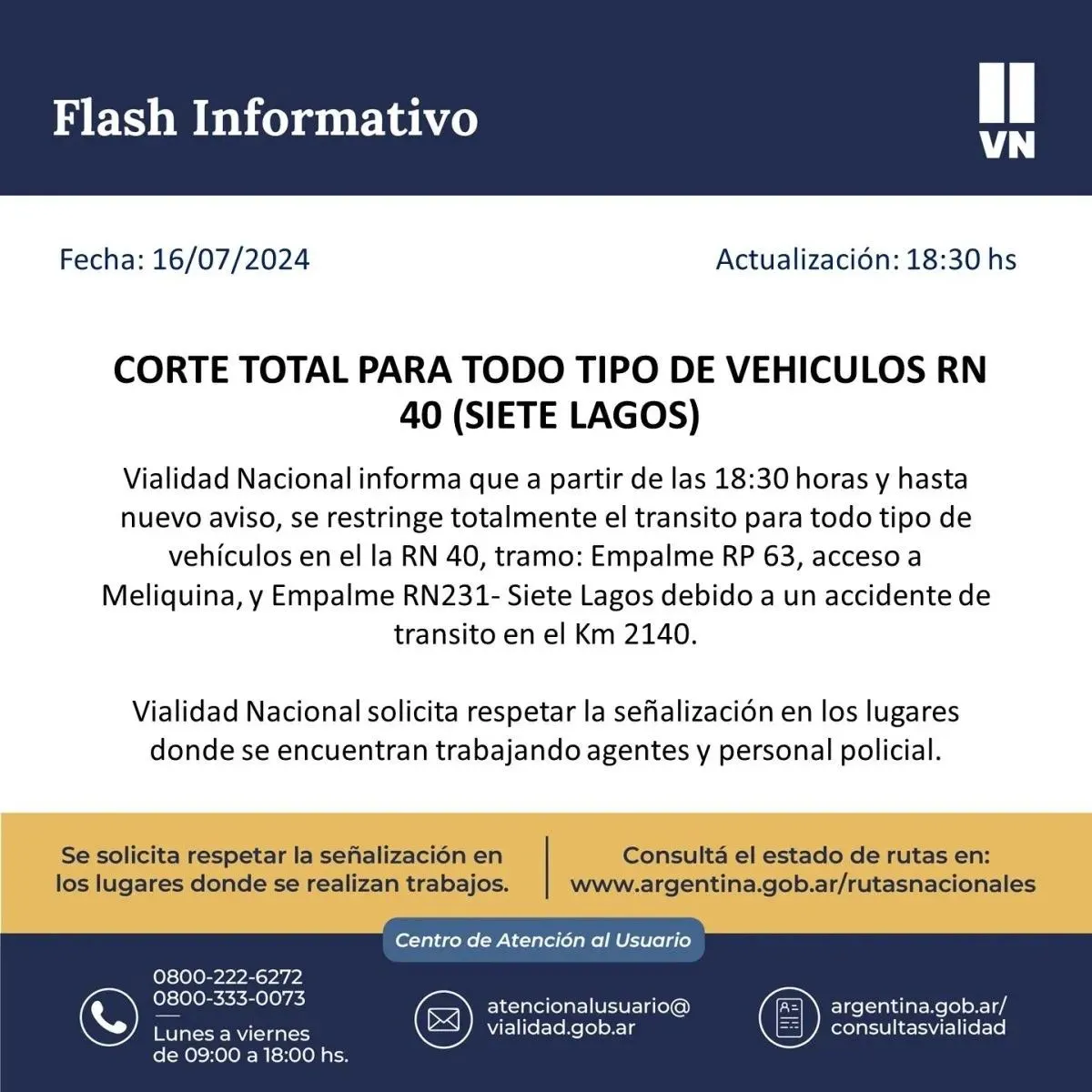 Se recomienda a los conductores buscar rutas alternativas. En el lugar se encuentra personal policial y de Vialidad Nacional trabajando para atender la situación y habilitar el tránsito lo antes posible.