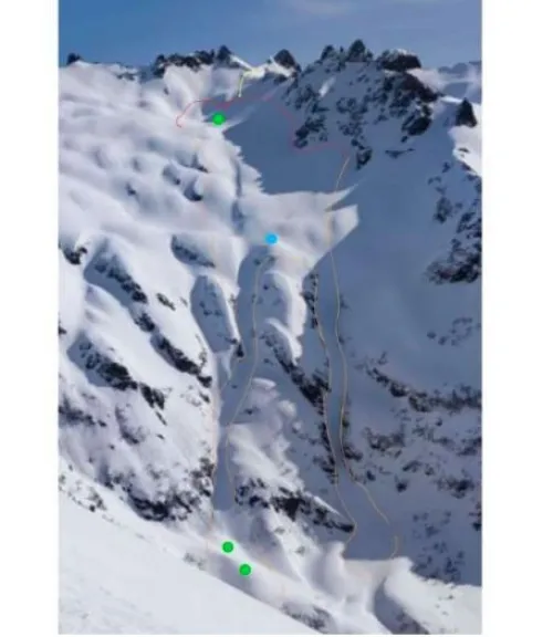 Vista frontal de la ladera. En amarillo el punto de acceso de los esquiadores. En rojo la corona estimada. En naranja los laterales de la avalancha y sus límites inferiores. En verde la ubicación de los esquiadores arrastrados. En azul punto de extracción del helicóptero. Foto: informe CIAv.