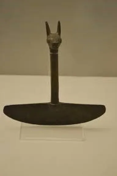 Tiene una hoja circular que lo hace reconocible y el mango está decorado con figuras humanas o de animales.