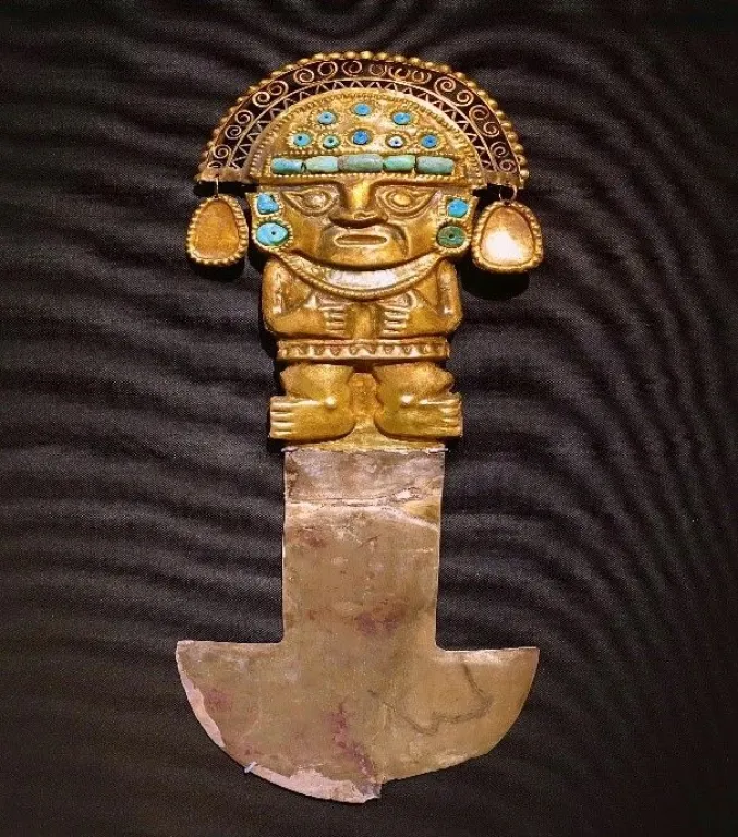 La elaborada figura humana en la empuñadura representa al dios Naylamp, fueron descubiertos en sitios arqueológicos Huaca y las ventanas en Lambayeque.