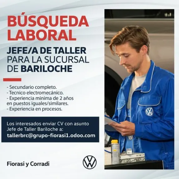 Fiorasi y Corradi, concesionario oficial Volkswagen seleccionará Jefe/a de Taller para la sucursal de Bariloche. La búsqueda apunta a cubrir un puesto de suma responsabilidad y experiencia técnica.
