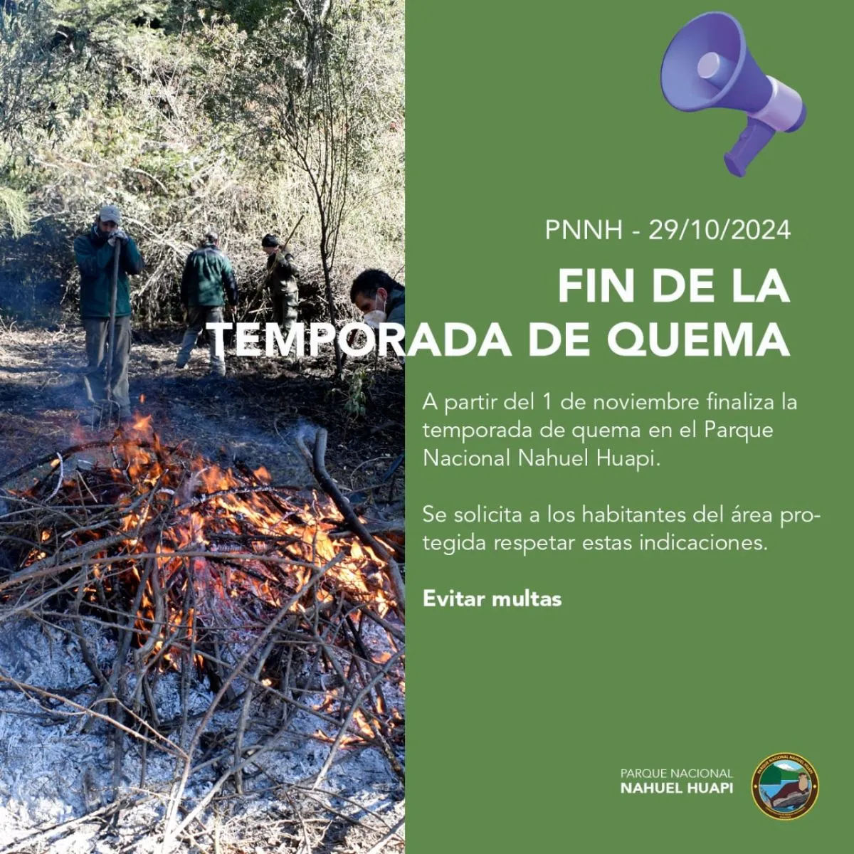 La intendencia del Parque Nacional Nahuel Huapi a través del Área Técnica del Departamento de Incendios Comunicaciones y Emergencias, informó que, ante el aumento de sequedad en los combustibles finos que incrementan el peligro de incendios en pastizal, se dio por finalizada la temporada de quemas simples 2024.