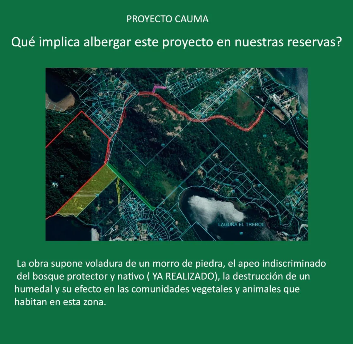 “Este emprendimiento, aprobado por resolución, es el resultado de la violación de todas las Ordenanzas Municipales, Provinciales y la Ley de Bosques, y a pesar de que  consideramos ilegítimo el Plan de Desarrollo del Oeste, éste considera supuestamente de alto interés la opinión de los vecinos que habitan el lugar para darle curso a un proyecto.Sin embargo, cientos de vecinos del área han firmado en contra, y las Juntas del Oeste lo han cuestionado fuertemente, y eso no ha resultado en ninguna marcha atrás del Ejecutivo Municipal, en un proyecto a ojos vista oscuro y borrascoso y repleto de irregularidades” afirmaron desde el conjunto de vecinos.