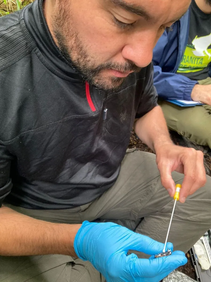 Rocchi realizando hisopados a ranitas de Darwin en Chile. Foto: gentileza.