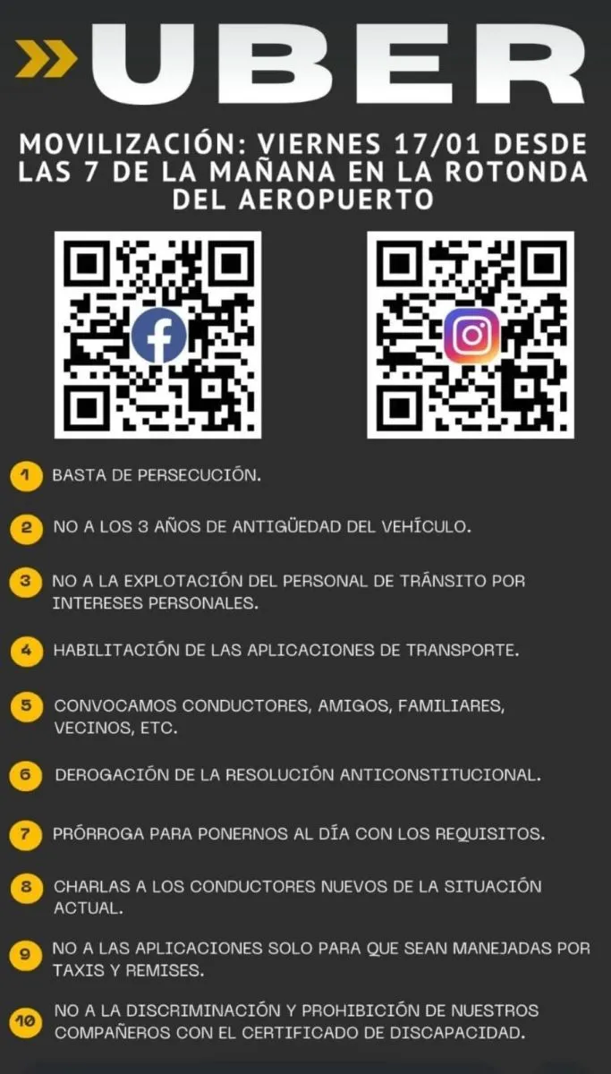 La marcha se realizará este viernes 17 en la rotonda del Aeropuerto a partir de las 7 de la mañana. Bruno Galdín, chofer residente de la aplicación, dialogó con ANB acerca de cómo se encuentran las instancias de regulación de Uber en la ciudad. “Los choferes seguimos sin respuestas. El proyecto todavía está en Asesoría Letrada y el Concejo recién vuelve a trabajar el 5 de marzo. El intendente no quiere dar de baja la resolución que nos impide trabajar y para el director de Tránsito y Transporte, los taxistas y remiseros sí pueden usar Uber, pero en realidad, la legislación prohíbe la aplicación en su conjunto”, expresó.