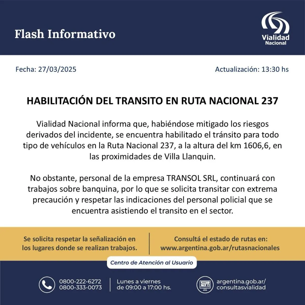 Luego de cinco días de interrupción del tránsito en la ruta 237, se habilitó el paso para todo tipo de vehículos a la altura del km 1606. En la zona en la que se produjo la colisión vial entre el camión cisterna y el vehículo particular, se encuentra trabajando en el desvío del tránsito personal policial y trabajadores de la empresa TRANSOL SRL.