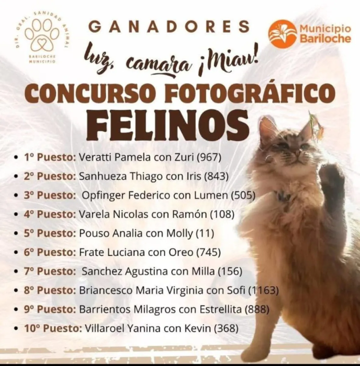 Hace unas semanas, el municipio lanzó un concurso para que barilochenses envíen imágenes de sus gatos y participen en el certamen denominado "Tu gato puede ser una estrella". Este fin de semana, se conocieron a los 10 ganadores que recibirán distintos premios.