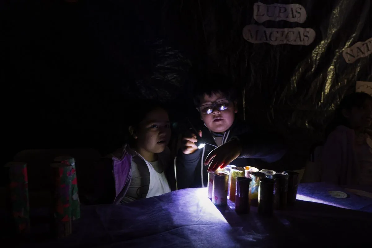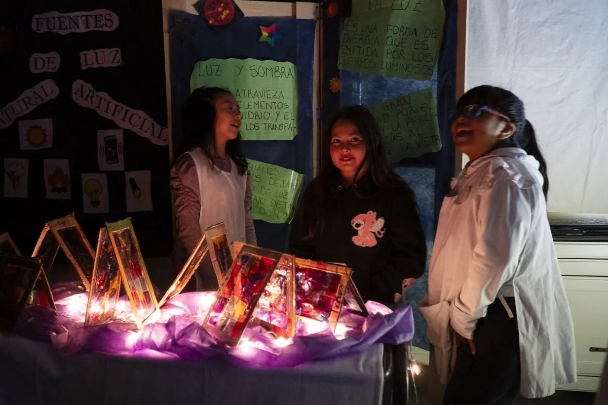 Cada salón fue ambientado según la temática elegida. Los alumnos de segundo grado sumergieron a los visitantes en la oscuridad para explorar la composición de la luz mediante linternas que proyectaban rayos de distintos colores sobre objetos especiales. Los pequeños actuaron como guías en esta experiencia sensorial que despertó la curiosidad de grandes y chicos.