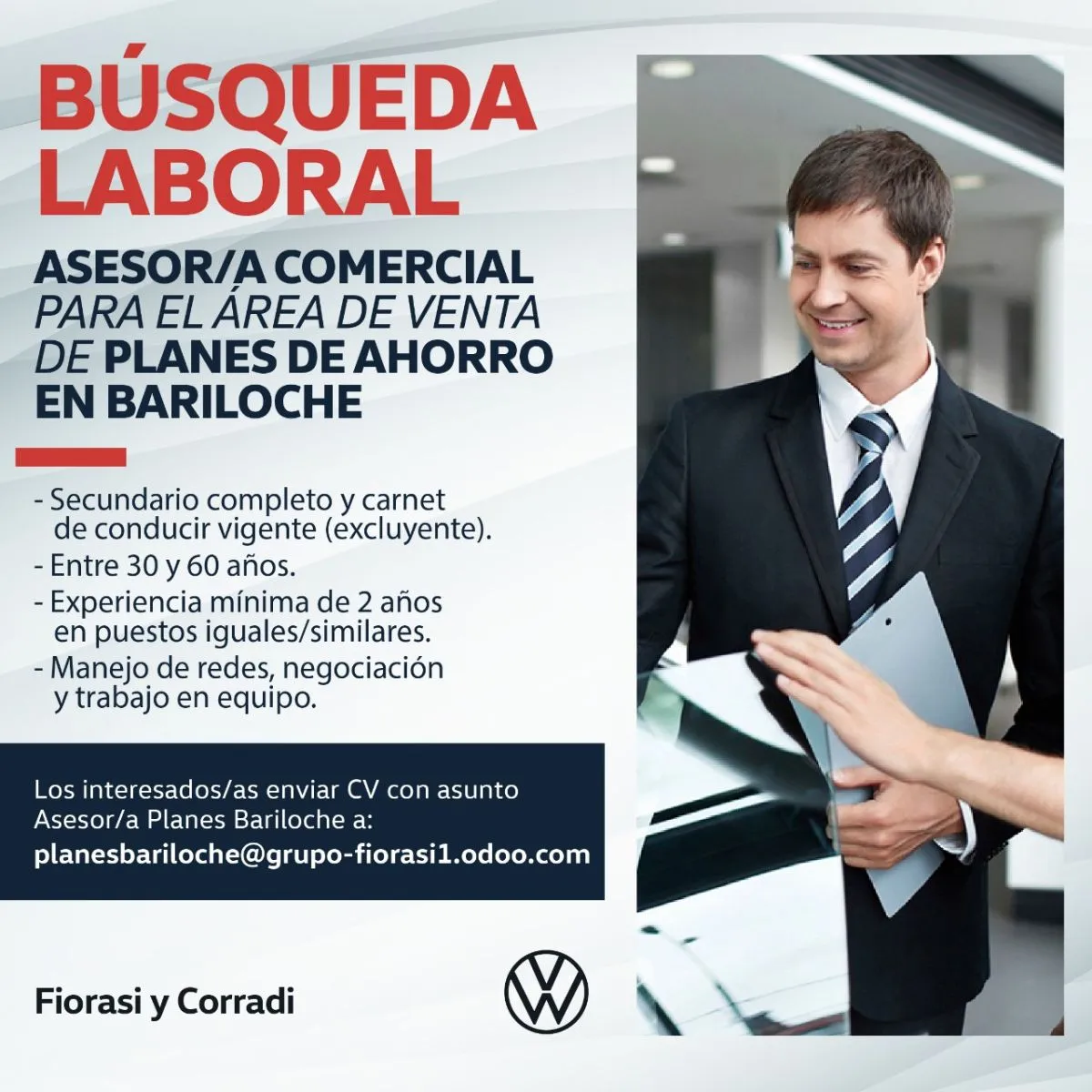 Fiorasi y Corradi, concesionaria oficial de Volkswagen en Bariloche, lanzó una convocatoria para incorporar un asesor o asesora comercial destinado al área de venta de planes de ahorro. La búsqueda apunta a sumar un profesional que pueda desarrollarse en el competitivo mercado automotriz de la región.