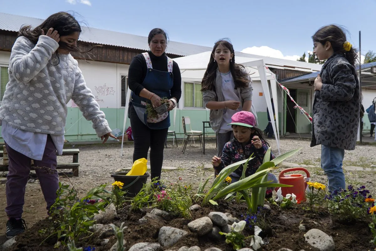 Docentes y estudiantes embellecieron el patio plantando flores en los canteros. Foto: Marcelo Martínez.