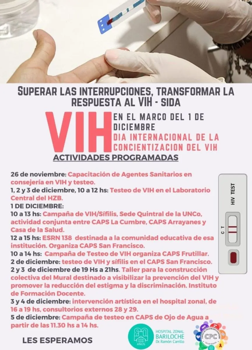 El 1 de diciembre, de 10 a 13 horas, en el hall de la UNCo Bariloche (Quintral 1250), los CAPS La Cumbre, Arrayanes y Casa de la Salud, junto al Centro de Prevención Combinada del Hospital Zonal Bariloche, realizarán testeo con pruebas rápidas de VIH y sífilis.