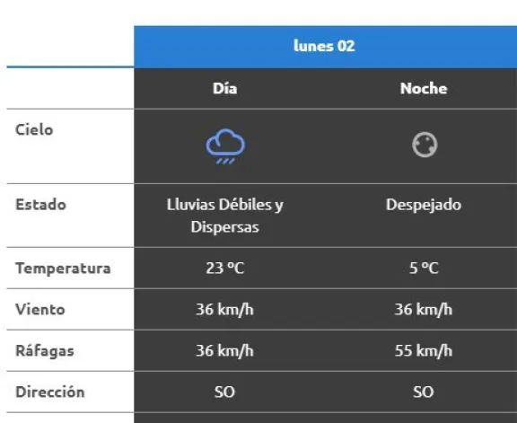 Hacia la noche, el tiempo tenderá a mejorar. El cielo estará despejado, pero el descenso térmico será marcado: la mínima prevista es de 5°C. El viento continuará soplando del sudoeste a 32 km/h, con ráfagas que podrían alcanzar los 55 km/h.
