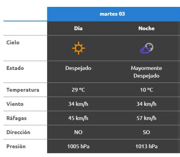 Hacia la noche, las condiciones se mantendrán mayormente despejadas, aunque con un marcado descenso de la temperatura, que bajará hasta los 10°C. El viento rotará al sector sudoeste (SO) y mantendrá una intensidad promedio de 34 km/h, con ráfagas más fuertes que podrían llegar a los 57 km/h. La presión ascenderá a 1013 hectopascales.