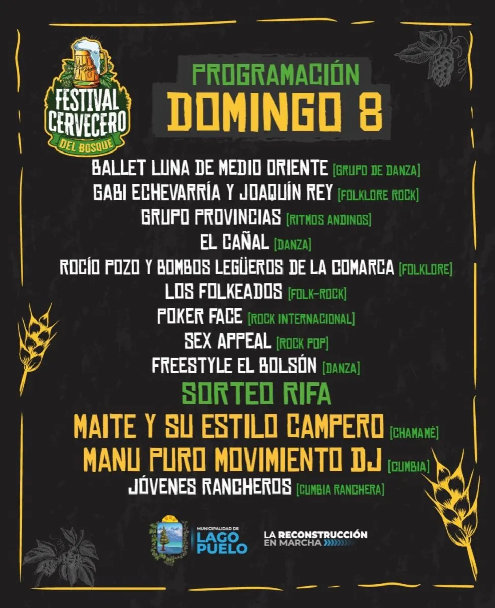 El Festival Cervecero del Bosque se consolida como una celebración para toda la familia, con música en vivo, cervezas artesanales, propuestas gastronómicas y feria de productores y artesanos, enmarcado en el incomparable paisaje de Lago Puelo.