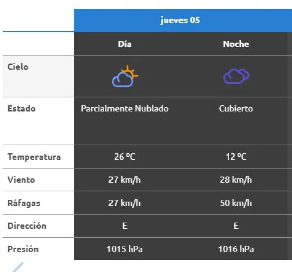 En la ciudad de Neuquén y el Alto Valle, este jueves se presentará con cielo parcialmente nublado durante el día, mientras que hacia la noche las condiciones tenderán a cubrirse por completo. La temperatura máxima alcanzará los 26 grados, mientras que por la noche la mínima descenderá hasta los 12 grados. El viento soplará desde el sector este con velocidades cercanas a 27 kilómetros por hora durante el día y 28 kilómetros por hora por la noche, con ráfagas que podrían alcanzar los 50 kilómetros por hora en las últimas horas de la jornada.