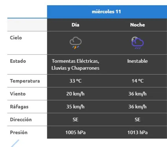 Hacia la noche, el pronóstico indica que el tiempo continuará inestable, aunque con menor intensidad de precipitaciones. En ese período el viento aumentará su velocidad y podría alcanzar los 36 km/h, también desde el sudeste.