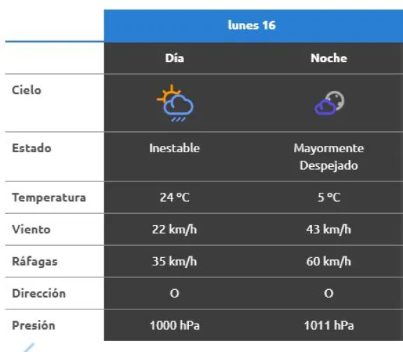 Las ráfagas podrían alcanzar los 35 km/h durante el día y cerca de 60 km/h por la noche, por lo que el viento se hará sentir especialmente en horas de la tarde y la noche en el Alto Valle.