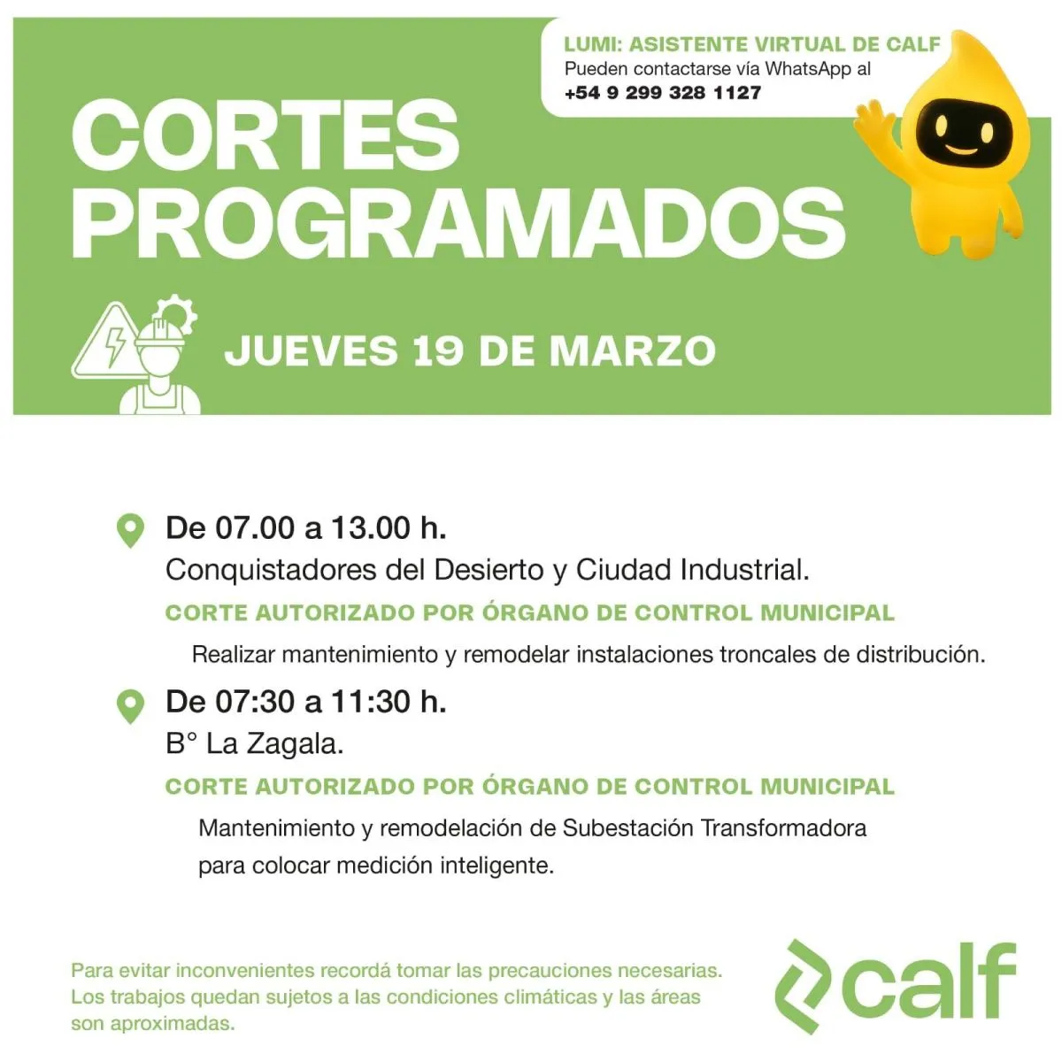 Por otra parte, CALF recordó que los usuarios pueden comunicarse a través de su asistente virtual “Lumi”, disponible vía WhatsApp, para realizar consultas o recibir información actualizada sobre el servicio.