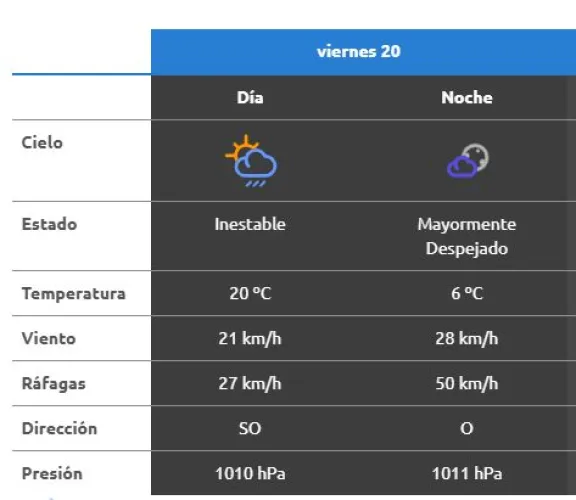El viento será otro de los protagonistas de la jornada. Durante el día soplará desde el sector sudoeste (SO) con velocidades que rondarán los 21 km/h y ráfagas que podrían alcanzar los 27 km/h. Sin embargo, hacia la noche se intensificará, rotando al oeste (O), con velocidades de hasta 28 km/h y ráfagas que podrían llegar a los 50 km/h.