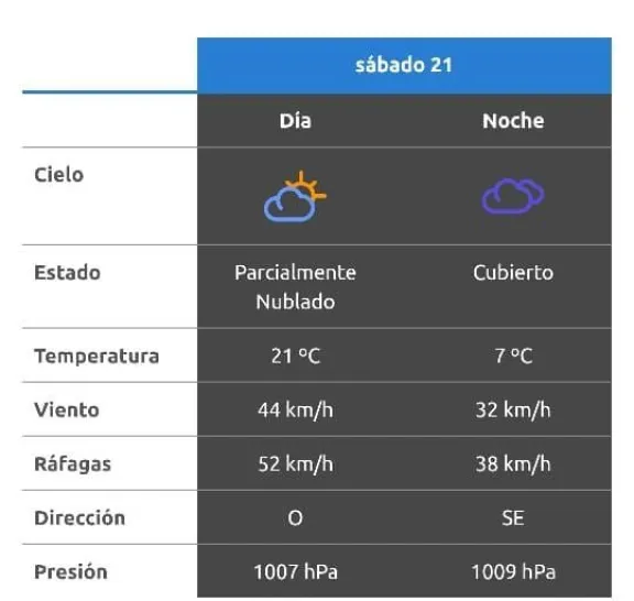 Por la noche, si bien el viento disminuirá su intensidad, continuará presente con velocidades cercanas a los 32 km/h y ráfagas de hasta 38 km/h, rotando hacia el sudeste. Este cambio en la dirección del viento estará acompañado por el aumento de la nubosidad, lo que dará lugar a un cielo mayormente cubierto.