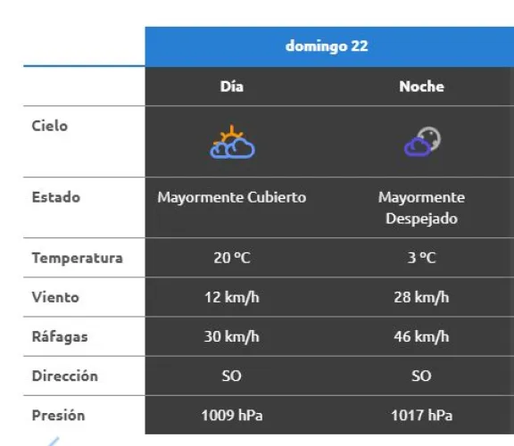 En cuanto al viento, durante el día se prevé una intensidad leve, con velocidades cercanas a los 12 kilómetros por hora desde el sector sudoeste. Sin embargo, hacia la noche el viento incrementará su intensidad, alcanzando los 28 kilómetros por hora, con ráfagas que podrían llegar hasta los 46 kilómetros por hora, manteniendo la misma dirección.