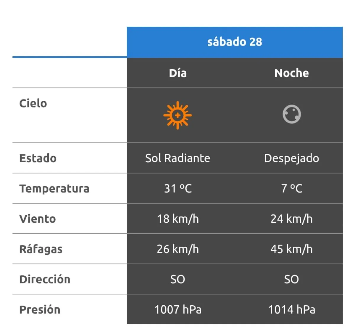 El viento soplará desde el sector sudoeste a 18 km/h durante el día, con intensificación hacia la noche, cuando alcanzará los 24 km/h. Las ráfagas también se harán sentir, con picos de hasta 26 km/h en horas diurnas y 45 km/h por la noche, especialmente en áreas abiertas del Alto Valle.