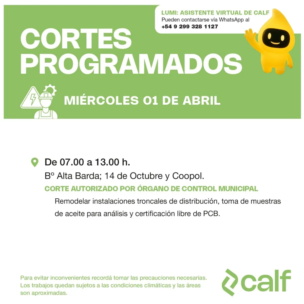 La cooperativa CALF informó que este miércoles se realizará un corte programado de energía eléctrica en la ciudad de Neuquén, que afectará a un sector del barrio Alta Barda durante varias horas de la mañana.